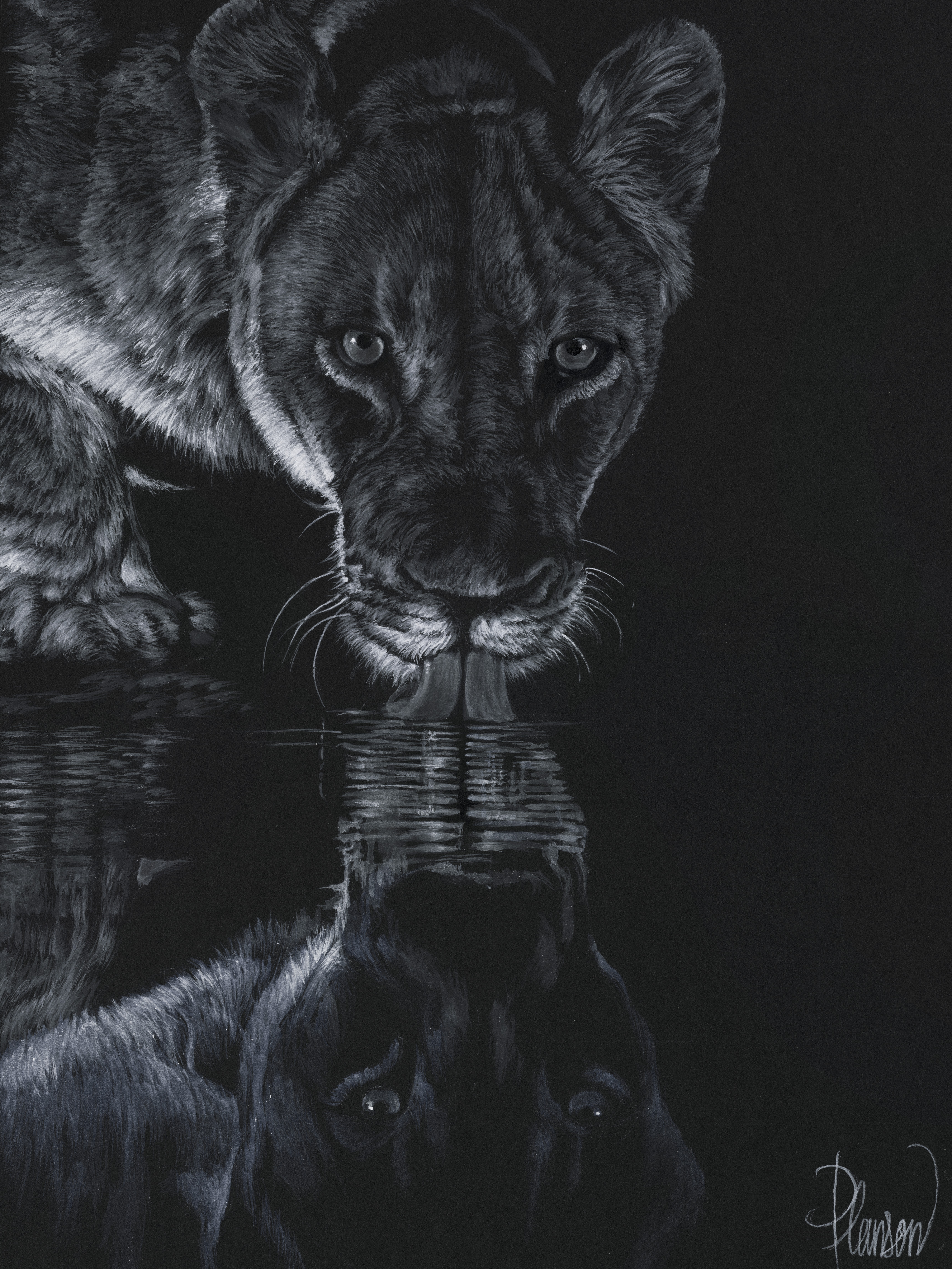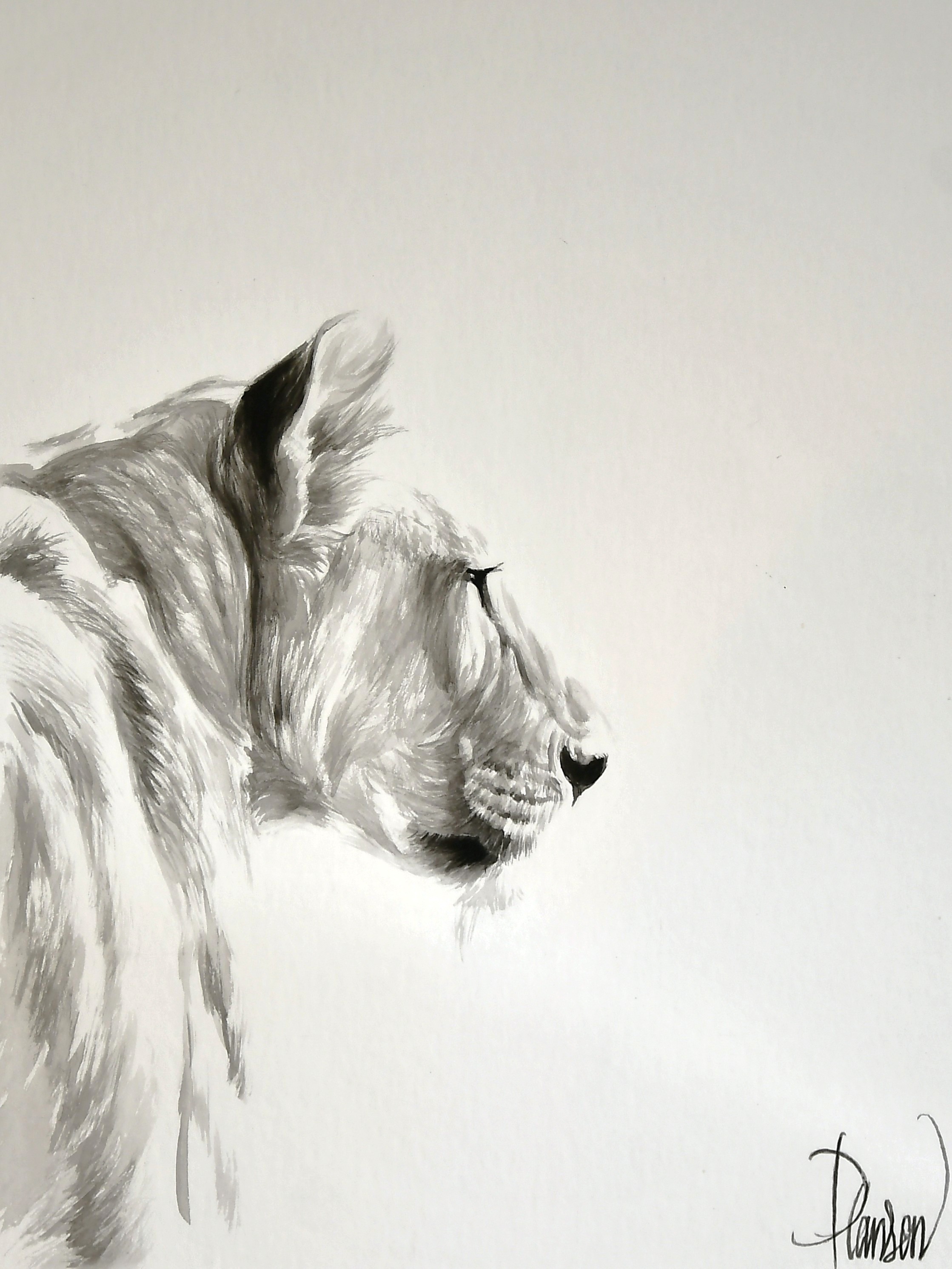 Tout de noir et blanc, l’animal apparaît. Quelques lignes, une lumière, un regard. Une présence s’impose, essentielle, silencieuse, immédiate…